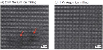 2 kV FIB가공에 있어서 Ga+이온 조사에 따른 FIB데미지(빨간색 화살표)가 관찰되어집니다.(그림a) 한편, 1kV Ar 이온밀링에 있어서는 FIB Damage층은 제거되어 샘플의 구조가 명료하게 관찰 가능합니다.