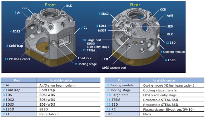 그리고 새롭게 설계한 대용량 시료실에는 EDS*1나 EBSD*2 등 각 분석장치에 대응하는 다수의 액세사리 포트를 설치 함으로 직경 150mm사이즈 시료의 전면 가공 관찰이 가능한 대형 저진동 시료 스테이지를 탑재하고 있습니다.