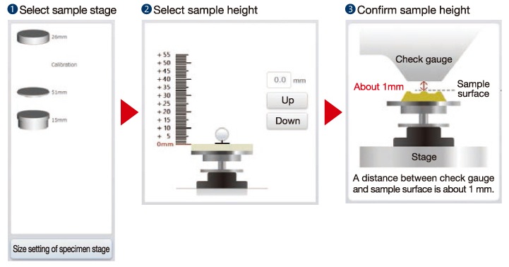 GUI 상에서 시료 교환 시의 순서가 표시됩니다.사용자의 오작동에 의한 시료 접촉의 위험성 등을 피할 수 있습니다.높이를 확인하기 힘든 요철이 있는 시료나 대형 시료라도 안심하고 시료 교환이 가능합니다.
