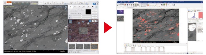 SU3800/SU3900은 미국 Media Cybernetics사의 화상 처리 소프트웨어 Image-Pro®에 SEM 화상을 전송하는 기능인 IPI를 탑재했습니다.한 번 클릭으로 SEM 화상으로부터 다양한 기능을 가진 계측 소프트웨어로 데이터를 옮길 수 있습니다.