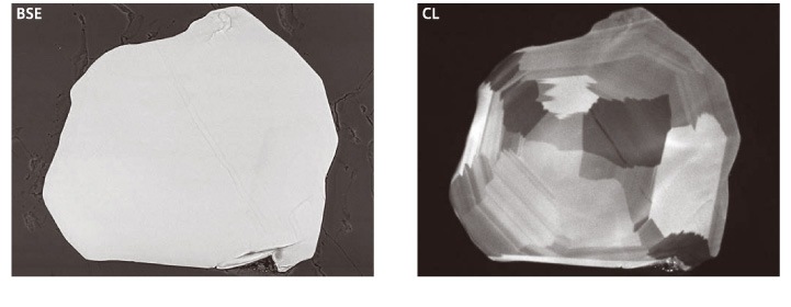 지르콘 결정을 동일 시야에서 관찰한 결과를 보여줍니다.BSE상에서는 지르코늄 농도의 작은 차이를 가시화하는 것이 어렵습니다.반면 CL상에서는 어두운 영역이 지르코니움의 농도가 짙은 영역이라는 것을 확인할 수 있습니다.