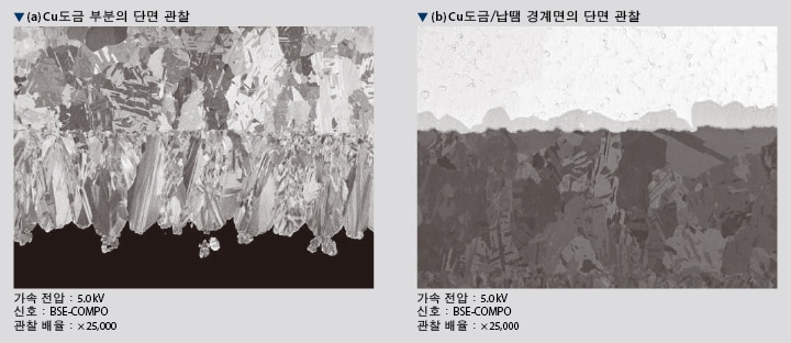 (b)에서는 Cu도금/납땜 경계면 부분의 합금층이나 Pb프리 납땜의 입자 경계 부분에 분포하는 Ag 입자를 뚜렷하게 확인할 수 있습니다.