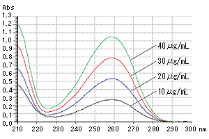 Satisfactory measurement is achievable even with 5, 25 and 50 ?L micro-sample cells because the beam is finely converged in the sample compartment. Shown here are spectra determined in the ultraviolet region by measuring nucleic-acid adenosine with a micro-sample cell (internal volume 25 ?L). A high S/N ratio was obtained.