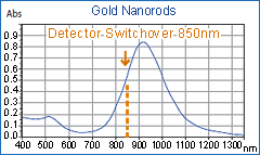 Normally the aspect ratios of Au nanorods are determined by image-measurement using the transmission electron microscope (TEM). However, the aspect ratios of rods can easily be determined by measuring the peak location of the surface plasmon bands originating from the major-axis at around 900 nm.1) (Au nanorods have 2 surface plasmon bands along the major- and minor-axes originating from surface plasmon oscillation, as opposed to Au nano-particles that normally have only one surface plasmon band at around 520 nm. The absorption of Au nanorods is at around 520 nm for minor-axis and 900 nm for major-axis.) Peak location is derived from formula 1 based on the aspect ratio (R) of Au nanorods. Formula 2 will be obtained by solving formula 1 for the aspect ratio (R).