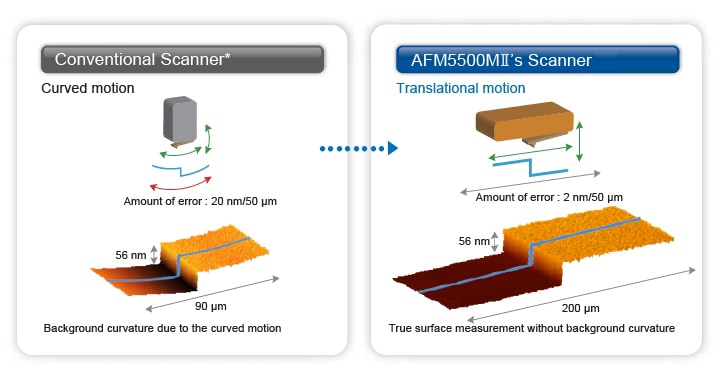 Conventional AFM with a piezoelectric tube scanner requires data flattening or leveling because of its intrinsic curved motion. However, this flattening may distort a sample' s micro-surface structure, including its Z value. The newly developed AFM5500MⅡ is equipped with a flexure-based scanner that enables well-controlled raster scans along X and Y directions only. As a result, this advanced scanner design can effectively eliminate background curvatures in a wide scan area and improve the accuracy of AFM measurements.