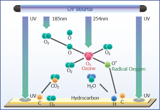 The ZONESEMII uses a UV lamp with wavelengths of 185 nm and 254 nm to efficiently remove hydrocarbons. Ozone is generated from oxygen in the vacuum-controlled specimen chamber, and generated ozone is broken into oxygen and activated oxygen. Hydrocarbons on the specimen surface are broken into volatile molecules such as CO2, H2O by radical oxygen and UV. The exhaust pump evacuates the free molecules from the sample chamber.