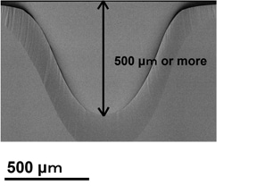 When the swing angle during cross section milling changes, the corresponding processing width and depth change. The figure below shows the SEM images of a Si wafer after cross section milling. Processing conditions are the same as shown above except the swing angle has been reduced from ±30˚ to ±15˚. It is demonstrated that the processing depth is deeper than the above results and therefore very effective for rapid cross section preparation of specimens with a target structure far from the top surface.