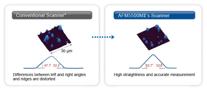 This cross-talk leads to distortions and asymmetrization. The improved AFM5500MⅡ’s scanner reduces cross-talk making both accurate and symmetric measurements possible.