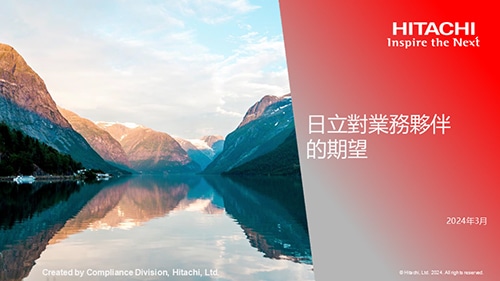 - 我們隨時皆以和的精神為根本,齊心協力,致力於公司內部的團結以及與日立集團之間的協調。同時,與廣闊世界中的各個國家相互尊重理解、建立友好的關係、並積極應對全球性規模的環境問題與人權尊重。