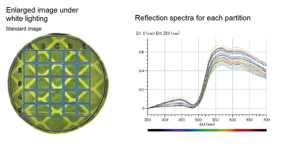 The sample is illuminated with monochromatic light at wavelengths of 360 to 700 nm and with white light. An image is captured under each illumination condition, and the fluorescence spectrum is simultaneously acquired by the fluorescence-side spectroscope. After measurement, the 3-D fluorescence spectra are displayed (excitation wavelength, fluorescence wavelength, and fluorescence intensity). An enlarged image and fluorescence and reflection spectra for each partition can be displayed using the dedicated analysis software. The reflection and fluorescence distribution of samples with in-plane nonuniformity can be captured as images and spectra.