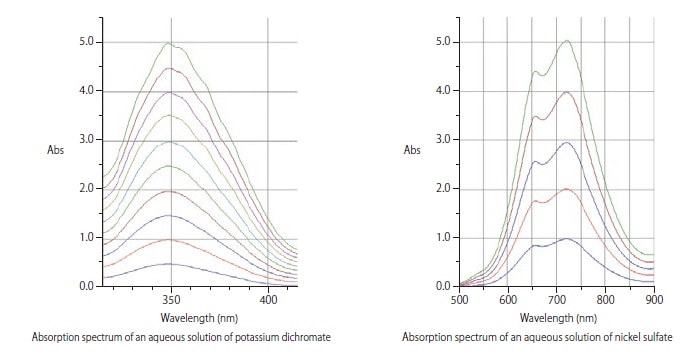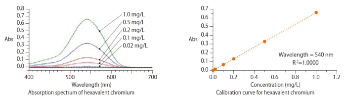 We present an example of analysis by diphenylcarbazide absorptiometry of hexavalent chromium, which is subject to regulation by the RoHS directive. Hexavalent chromium was measured using “Reagent Set for Water Analyzer No. 31 Chromium (Hexavalent)” made by Kyoritsu Chemical-Check Lab., Corp. From the absorption spectrum measurement results, the presence of an absorption peak at a wavelength of 540 nm was confirmed. Good linearity was obtained for the calibration curve at the 540 nm absorption peak with R2 = 1.0000.