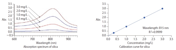 The measurement for silica by molybdenum yellow absorptiometry is prescribed in JIS K0101 Testing Methods for Industrial Water. Silica was measured using “Reagent Set for Water Analyzer Silica” manufactured by Kyoritsu Chemical-Check Lab., Corp. From the absorption spectrum measurement results, the presence of an absorption peak at a wavelength of 815 nm was confirmed. Good linearity was obtained for the calibration curve at the 815 nm absorption peak with R2 = 0.9999.