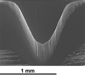 When the swing angle during cross section milling changes, the corresponding processing width and depth change. The figure below shows the SEM images of a Si wafer after cross section milling. Processing conditions are the same as shown above except the swing angle has been reduced from ±30˚ to ±15˚. It is demonstrated that the processing depth is deeper than the above results and therefore very effective for rapid cross section preparation of specimens with a target structure far from the top surface.