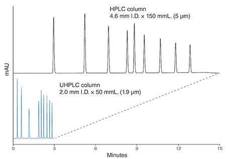 The 60 MPa system, which can be used with columns containing 2.0 µm or smaller particles, and core-shell columns, is capable of conventional HPLC analysis and also ensures improved resolution performance and shorter analysis time.
