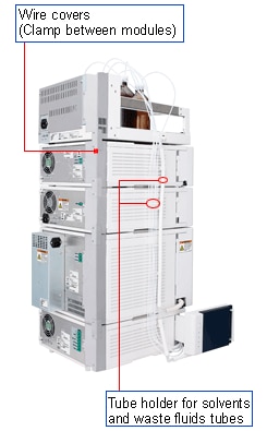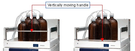 Most optional accessories are internally mounted to reduce the HPLC system's height. The handle located on the front side of the organizer moves vertically for easy access to solvent bottles.