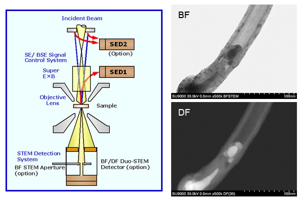 The SU9000 is also an incredibly powerful low-kV STEM, often exhibiting higher contrast on critical sample features than high-energy S-TEM systems. In addition, simultaneous Brightfield and annular Darkfield imaging is possible with the Darkfield detector settable to 56 different positions for an optimized selection of Z-contrast of the pattern of interest.