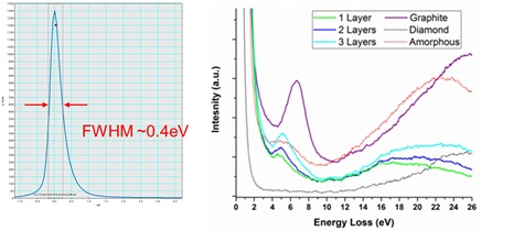 Figure 1 Left: despite the low (± 30 keV) energy of these electrons, the energy spread of the electron beam, measured by our own Hitachi EELS is 400 meV or less:. Right: EELS spectra differentiating between single , double and triple layers of graphene , graphite, diamond, and amorphous carbon.